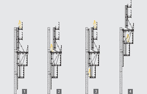 Superior performance compared to conventional climbing with crane. The short recycling process controlled all by automatic hydraulic cylinders make a very fast construction pace, and easy operations.
